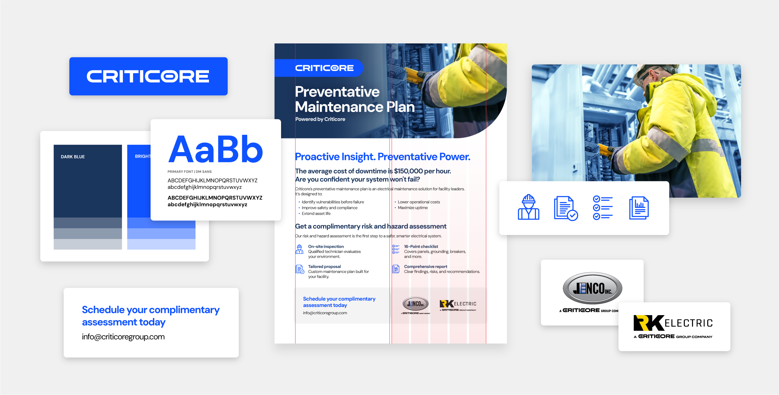 In our example, the bold headline Preventative Maintenance Plan leads the design, while the subhead Proactive Insight. Preventative Power. reinforces the message. The logo is present but secondary, quietly supporting credibility.