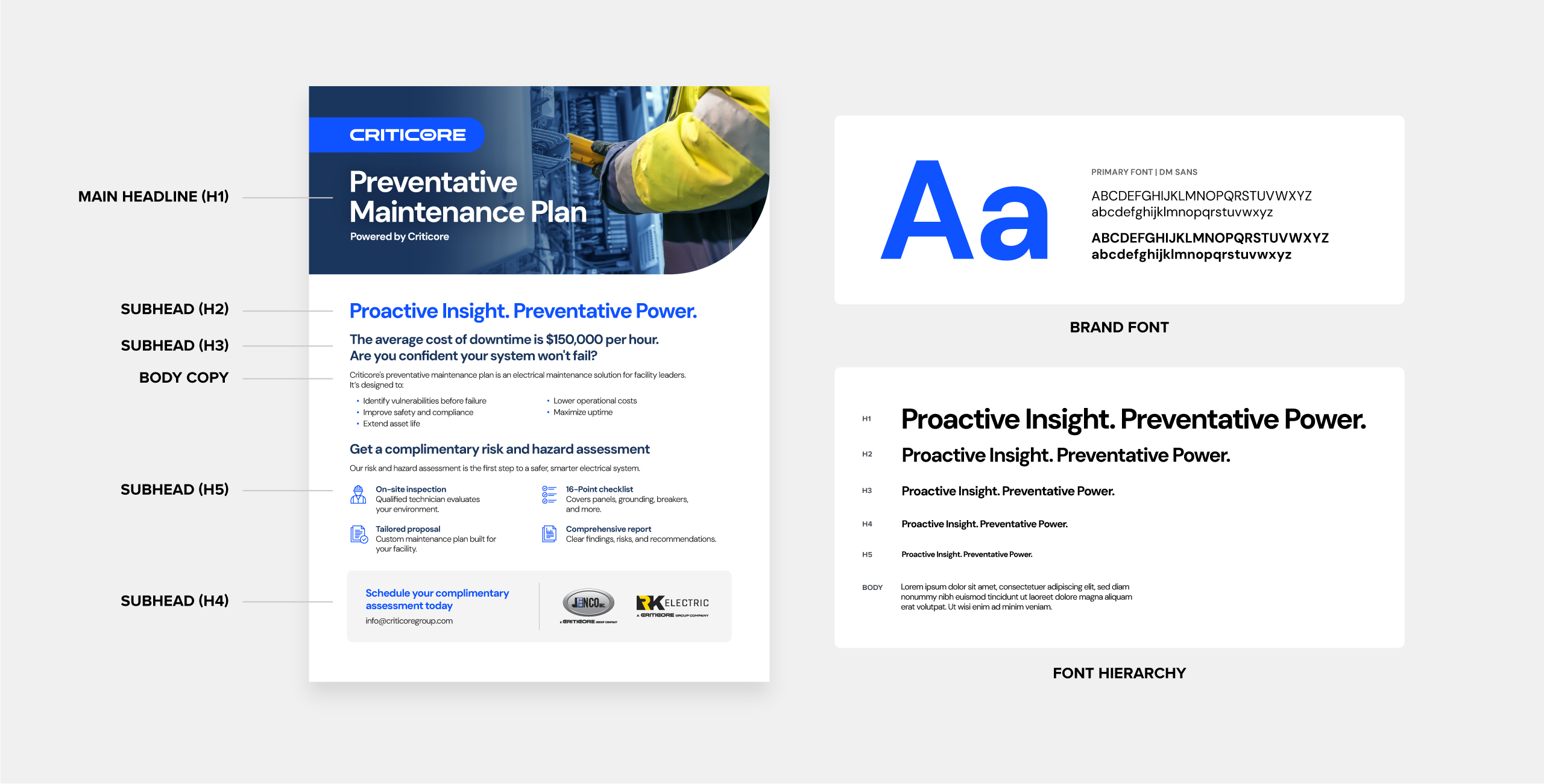 In the example, everything follows a clear rhythm. The headline Preventative Maintenance Plan leads, followed by the subhead Proactive Insight. Preventative Power., and a short, tension-building line pulls the reader in right away.