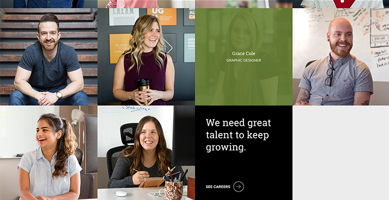 Our website uses a limited palette of black and white. We use our brand colour purely for our call-to-actions and navigation. Other colours are introduced through our imagery or interactions. These small pops of colour communicate our culture’s energy without being distracting.